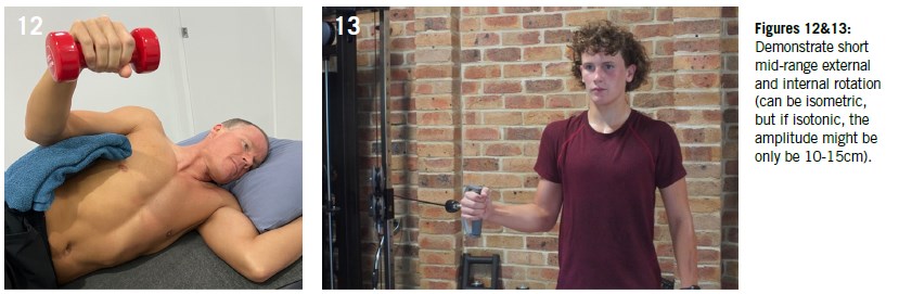Ideally, we aim to achieve heavy, low-volume, slow resistance that is efficacious for tendon adaptation over the medium to longer term18. We recommend implementing exercises through a short mid-range of motion (see Figure 12 demonstrating isometric neutral mid range external rotation). In our experience, commonly prescribed full-range generic external rotation loading exercises, in both neutral and abducted arm positions, are poorly tolerated by swimmers with supraspinatus and infraspinatus involvement. Conversely, in the anterior cuff (subscapularis involvement), isotonic short mid-range loading in neutral is well tolerated (Figures 13 & 14).