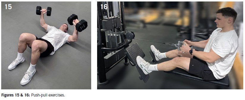EMG studies have demonstrated that the anterior and posterior cuff work reciprocally during pull and push movements19 respectively, so they can be prescribed, as an alternative, to load the cuff when traditional rotation loading is not well tolerated (Figures 15 & 16).