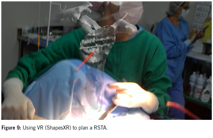 Mixed reality (MR) technology represents a significant advancement in this domain. MR platforms enable immersive visualization of preoperative plans and patient-specific anatomy during surgery through head-mounted displays. These devices project interactive 3D holograms into the surgeon’s field of view, which can include segmented CT or MRI data, the glenoid or humerus in virtual form, and even dynamic intraoperative navigation overlays. Unlike conventional navigation systems that require the surgeon to look away at an external monitor or sterile tablet, MR allows continuous focus on the surgical site with enhanced ergonomics.