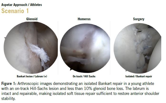 In cases where there is an on-track Hill-Sachs lesion with less than 10% glenoid bone loss and a repairable labrum, isolated Bankart repair is the preferred approach. This scenario is most common in younger athletes with minimal bony pathology, Figure 1.