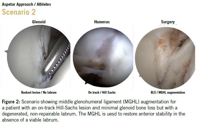 When the labrum is degenerated or non-viable, despite the lesion being on-track, middle glenohumeral ligament (MGHL) augmentation can be used to reinforce anterior stability, providing added resistance to anterior translation, Figure 2.