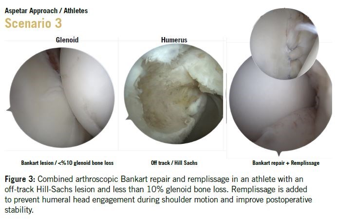 For athletes presenting with off-track Hill-Sachs lesions and less than 10% glenoid bone loss, the addition of remplissage to Bankart repair is our recommended strategy. This helps prevent engagement of the Hill-Sachs lesion during functional movements, Figure 3.