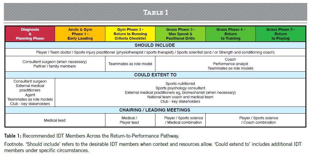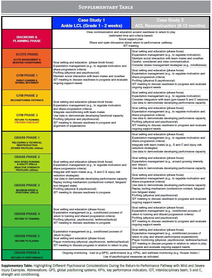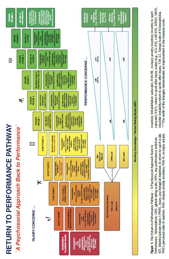 One pathway guiding return-to-performance following injury was suggested by Mitchell and Gimpel5. This uses 11 phases from diagnosis and planning to pitch-based preparation. The previous pathway mainly focuses on physical function. It did recognise a psychological aspect to be considered and profiled but lacked specificity to empower practitioners to address psychosocial factors.