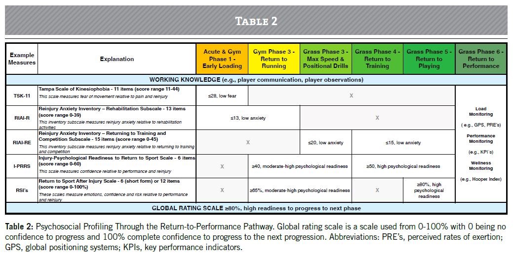 Even here, it is important to monitor the psychosocial status of the player. This will most likely be in the form of how non-injured players are routinely monitored (e.g., wellness, GPS metrics, KPI’s). Depressed performance metrics may be indicative of latent performance or injury-related concerns resurfacing, which can be further explored.