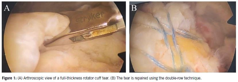 Arthroscopic tendon repair is the preferred surgical technique for RCTs. The arthroscopic technique most commonly utilizes suture anchors, arranged in either a single-row or double-row configuration (Figure 1). To enhance the tendon-to-bone contact area and promote superior healing outcomes, Lo et al. introduced the double-row repair technique. This method involves placement of a medial row of anchors, with sutures passed through the rotator cuff tendon in a mattress fashion, followed by the placement of a second, lateral row of anchors along the lateral aspect of the anatomical footprint20.