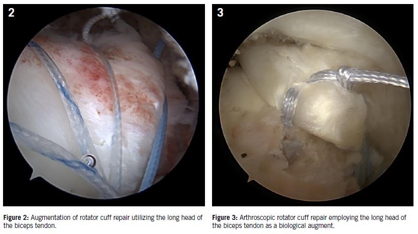 Despite having theoretical advantages of patch use in the treatment of RCTs, clinical studies supporting its use are still scarce. In 2022, Lee et al. conducted a prospective randomized case–control study among patients presenting with massive rotator cuff tears, those who underwent allograft augmentation using acellular human dermis and those without patch. reported At an average follow-up of approximately 5.7 years, patients with patch demonstrated a significantly lower retear rate compared to those who received repair without patch augmentation (9.1% vs. 38.1%, p = 0.034). Subgroup analysis further revealed that achieving complete footprint coverage intraoperatively was associated with improved outcomes in both groups. Both cohorts exhibited significant improvements in clinical scores with the patch-augmented group showing a significantly greater degree of functional enhancement27. The use of autografts such as the long head of the biceps tendon is gaining popularity (Figure 3). A systematic review covering eight case series with a total of 170 patients reported that outcomes following biceps autograft augmentation were comparable to those of other augmentation techniques. MRI follow-up was available for 112 patients, of whom 68 demonstrated intact reconstructed tendons28.