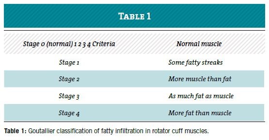Recent literature has demonstrated a correlation between higher preoperative Goutallier stages and increased rates of rotator cuff retear following surgical repair. Patients with Goutallier stages 0 to 1 typically exhibit good to excellent postoperative outcomes. In contrast, stage 4 is generally considered a contraindication for primary repair due to consistently poor clinical outcomes and a markedly elevated risk of retear. Management strategies for patients with Goutallier stages 2 and 3 remain a crossroad in the treatment of RCTs with no clear consensus regarding the optimal surgical approach8.