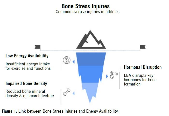 Recent research highlights the critical role of nutritional and hormonal factors in maintaining bone integrity and influencing injury risk. Factors such as Low Energy Availability (LEA), vitamin D deficiency, female menstrual dysfunction, poor bone health, and hormonal imbalances, impair bone remodeling and increase susceptibility to BSIs2 (refer to Figure 1).