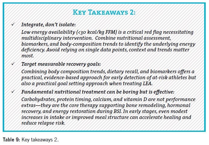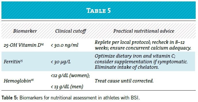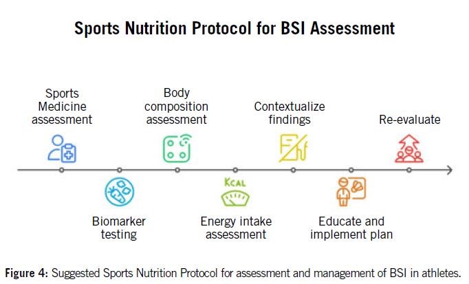 Table 5 highlights key clinical cutoffs to consider at initial BSI diagnosis. These results become most useful when the sports dietitian integrates them with a quantitative intake assessment (energy, protein, carbohydrate) and a body-composition assessment; this provides a clearer picture of energy availability, nutrient status, and recovery plan.