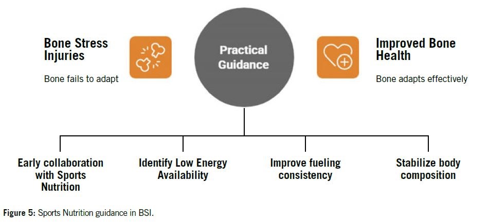 Taking a practical approach to bone health and EA means shifting the clinical lens from “what is broken” to “why the bone failed to adapt.” For sports physicians and physiotherapists, nutritional conversation is part of the treatment plan. When LEA is suspected, the message is to collaborate early with a sports or clinical dietitian, even if remotely as per Figure 5. Improving fueling consistency and body-composition stability are the nutritional milestones of recovery in BSI.