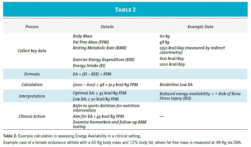 Since an EA below 30 kcal/kg FFM (example calculation shown in Table 2) is considered low and flags an athlete at risk for RED-S, a dietitian’s assessment should aim for an EA above 45 Kcal/Kg FFM6. Athletes identified with low EA should be promptly referred to a sports dietitian or clinical dietitian for a comprehensive management plan. This is often combined with rest or load modification, tailored nutritional supplementation, and close clinical follow-up.