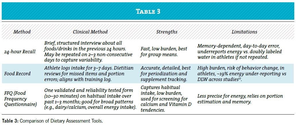 Quantifying an athlete’s nutritional intake is vital for identifying deficits contributing to BSIs. Among dietary assessment methods, the 24-hour dietary recall is a practical and time-efficient tool, providing a snapshot of energy intake, macronutrient consumption, especially protein and carbohydrates, and intake of chelators. In a research setting combining a 24-hour recall with a food record is advantageous, however when working in a clinical setting where time of consultation is defined, clinicians will rely on fast methods for quantitative assessments. Table 3 details the differences in dietary assessment methods11.