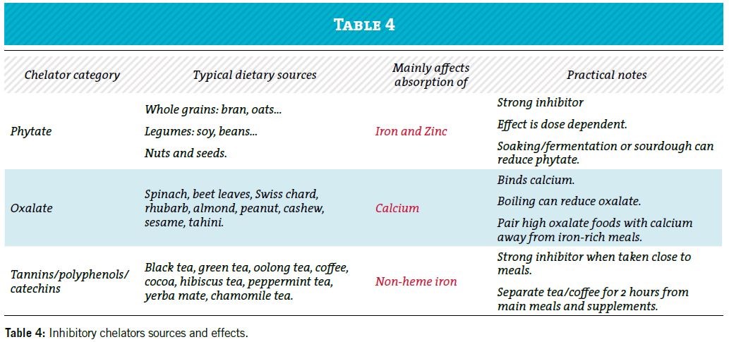 Chelators are food compounds that can greatly impair mineral absorption and affect bone health overtime. The sources are varied such as phytates (found in whole grains and legumes) and oxalates (present in spinach and beet greens) – they reduce the bioavailability of key minerals like calcium and iron13, exacerbating bone health issues and blood deficiencies. Monitoring chelator intake is particularly important in athletes following plant-based or restrictive diets and adolescents who have increased growth demands. Table 4 expands further on the chelators’ sources and effects, as some are a part of everyday meals and may be overlooked in bone health assessments.