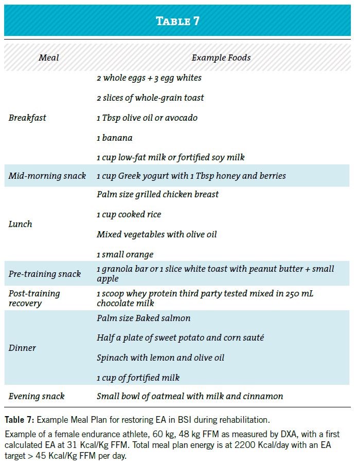 Prior to returning to full training or competition, athletes recovering from BSI should demonstrate the below understandings and have a typical eating and fueling pattern as the provided example in Table 7. The checklist below represents the major contributing factors that display athlete’s understanding of performance fueling: