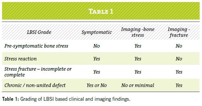 Lumbar bone stress injury (LBSI) presents in physically active adolescents and young adults. It occurs at the postero-lateral aspect of vertebral arch, typically in the region of the pars interarticularis, including the pedicle, lamina and articular facets1. It is also referred to as part of a spectrum of spinal pathologies known as spondylolysis. The term LBSI is preferred to spondylolysis, because the latter typically describes a larger spectrum of injuries that includes defects (symptomatic and asymptomatic), that are mostly the result of non-united stress fractures and therefore require a completely different management approach2. The injury is often missed in the early stages because the initial symptoms are similar to other non-specific causes of low back pain. It requires a high degree of clinician intuition to make the diagnosis early and attain better outcomes. This paper will highlight that LBSI is as relatively common sporting injury, results in long (6-12 months) recovery times, and has a high risk of complications such as recurrence and non-union. The aim of this paper will be to improve early detection of the injury and describe the management based on the stage of injury, so that athlete-patient can return to their pre-injury level of activity (including elite sport) and attain bone healing.