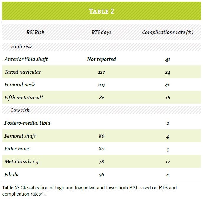 The unique bone geometry and mechanics that lead to LBSI, are also likely to be related to the high recurrence and non-union rates, and the long RTS times that makes LBSI one of the more complex BSI to manage. Hoenig et al.20 described BSI as either high or low risk, based on the risk of complications (delayed union, non-union, refracture, completed fracture, avascular necrosis, and failure to RTS) and the time taken to RTS. In their meta-analysis of lower limb and pelvic BSI, they reported that the fifth metatarsal, femoral neck, anterior tibial shaft, and tarsal navicular were all anatomical sites that represented high risk BSI based on those criteria (see Table 2). The meta-analysis only considered lower limb and pelvic BSI because they make up over 80% of all BSI in athletes. This paper is somewhat symbolic of the relative lack of attention that LBSI attract in the clinical sports medicine environments, probably because they are undiagnosed or misdiagnosed, and there is a wrongly held assumption that athletes can function unrestricted with non-united LBSI so that non-union is an inevitable (and often acceptable) outcome of LBSI. Table 3 highlights that LBSI has characteristics that could classify them as high-risk based on the criteria used by Hoenig et al.20. Saw et al.21 (Table 3) reported RTS times for LBSI are typically longer than the high-risk BSI reported by Hoenig et al, and with similar high complication rates, particularly with 33% recurrence rate and, with 18% of incomplete stress fractures and 47% of complete stress fractures that result in non-union21. Others have reported similarly high non-union rates, with Watura et al.22 reporting 43% of LBSI in elite athletes achieving partial healing and 19% achieving complete healing.