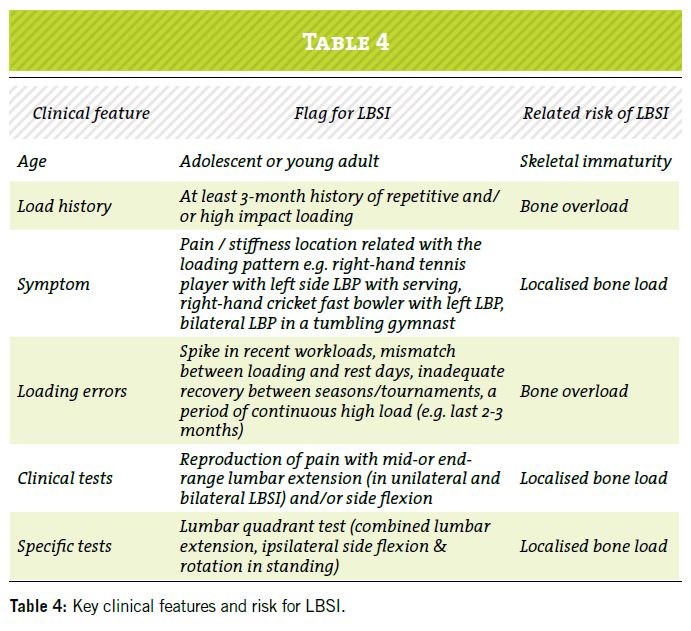 The clinical presentation of LBSI is similar to other causes of low back pain and is one of challenges to early detection. The features include a gradual onset of localised pain and/or stiffness that is typically first noticed post-physical activity (repetitive impact loading activities) but worsens over time to limit physical activity and start to impact on daily activities. Without a high degree of clinician intuition, the diagnosis is only often confirmed once symptoms (and therefore pathology) progress enough to be significantly limiting physical activity. Some of the key clinical features, when ongoing and in combination, which should flag clinicians to the possibility of LBSI are included in Table 4.