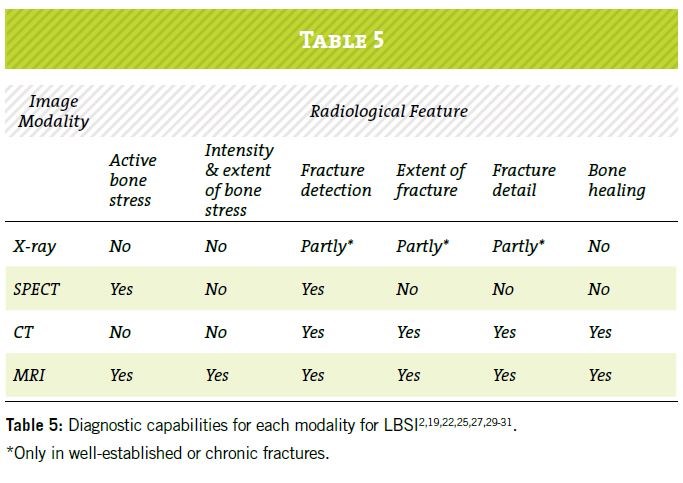There are numerous imaging modalities that have been traditionally used to diagnose and manage LBSI (Table 5). The imaging modality must be capable of detecting active bone stress, including the intensity and extent (spread) , establish the presence of a fracture / bone lesion2,19,25,28, measure size (length/width) of any fracture / lesion1 and provide clarity of fracture / lesion margins to determine the chronicity of any fracture, therefore establish if bone healing is likely. Table 5 highlights the diagnostic capabilities of each imaging modality and highlights why MRI is most utilised, especially as it does not involve ionising radiation2. It can reliably establish the presence of BMO (bone stress), and quantify the intensity and extent BMO using fat suppressed imaging sequences19,22,25 and accurately visualise the presence and extent of any fracture / lesion using fast 3D T1-weighted gradient-echo sequence that provide the spatial resolution and the image contrast provide near-Computed Tomography (CT) bone anatomy quality in three dimensions1,26. Limited (targeted to the spina level being assessed) CT can be used when MRI is equivocal regarding the presence or absence of a fracture, or if additional fracture clarity is required27.