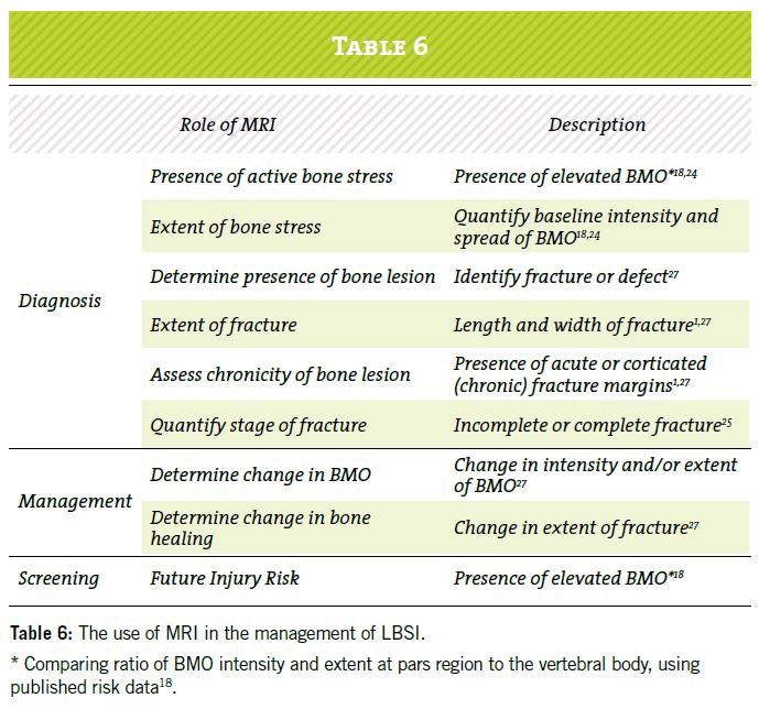 MRI should therefore be the first choice of imaging in the diagnosis and management of LBSI, with three key roles outlined in Table 6.
