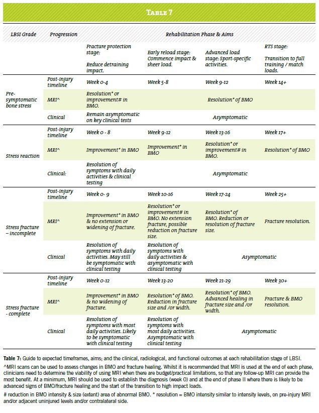 Where feasible, an MRI can be performed at the completion of this stage (Table 7) to provide reassurance that that the rehabilitation and daily activities of the preceding period have not adversely impacted the bone healing process and that a graded increase in loading can be planned for the next stage of rehabilitation.
