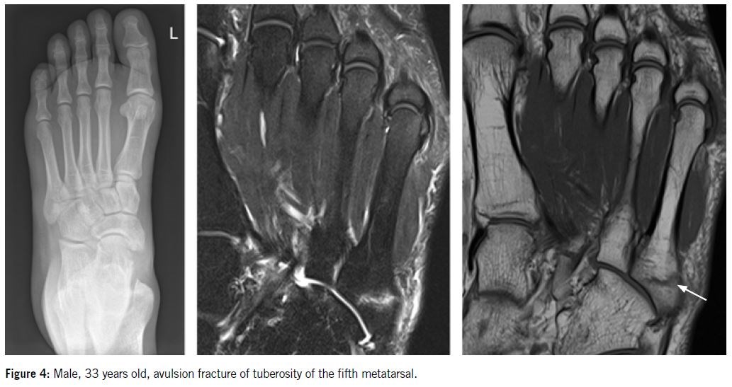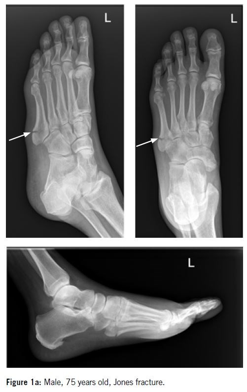 Fractures of the fifth metatarsal have attracted considerable attention since Sir Robert Jones injured his own foot while dancing around a tent pole at the military party in New Brighton in 18961. Since then, the literature has presented a wide range of often conflicting information regarding the classification, prognosis and treatment of these fractures2-5. Recently, proximal diaphyseal stress fractures of the fifth metatarsal have been increasingly reported in the athletic population11,12. These fractures account for approximately 10% of all sports injuries, with higher incidence in men than in women, and more frequently affecting the dominant leg. The incidence varies depending on the sport and the athlete's age. Due to their prevalence, complex healing process, and potential impact on performance, these injuries are a significant concern in sports medicine (Figure 1).