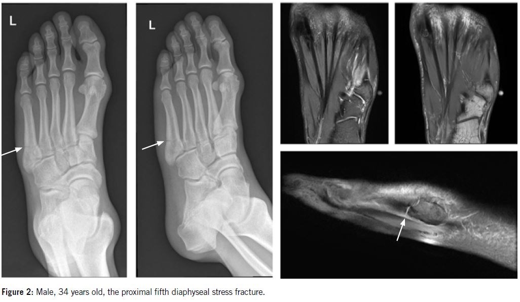 Proximal fifth metatarsal diaphyseal stress fracture present prodromal symptoms and typical radiograph features that differs from the clear radiolucent line in an acute fracture (Figure 2).