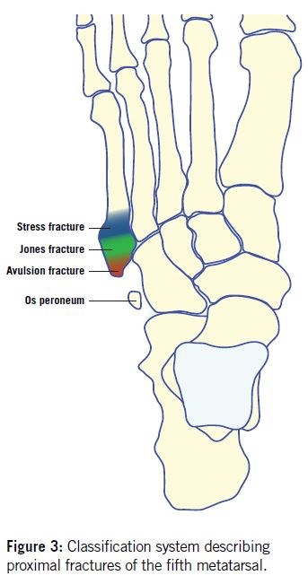 The Lawrence and Botte classification system (Figure 3) is commonly used and holds prognostic value based on fracture zone distributions. The proximal fifth metatarsal is divided into three zones: