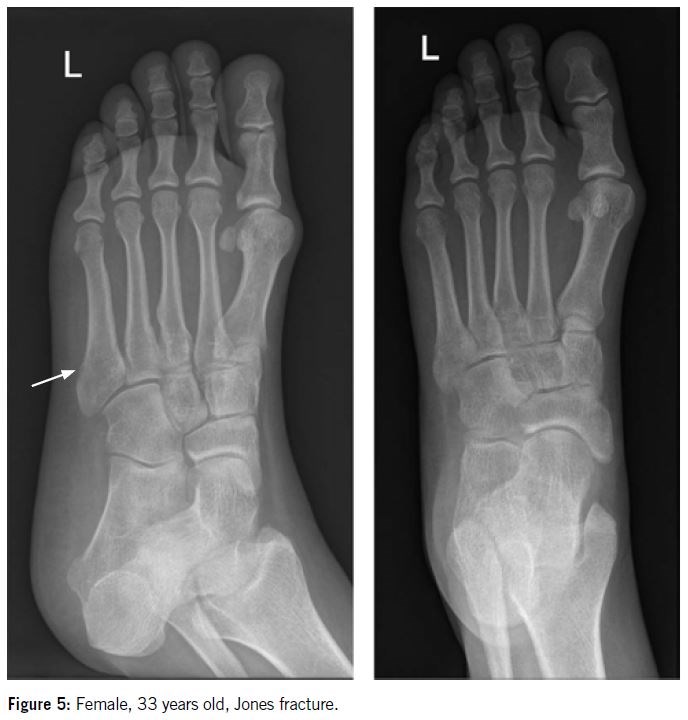 Several classification systems are used to describe proximal fractures of the fifth metatarsal. Sir Robert Jones first described the “Jones fracture” in a small case series of four patients, including himself, as a fracture at the metadiaphyseal junction.