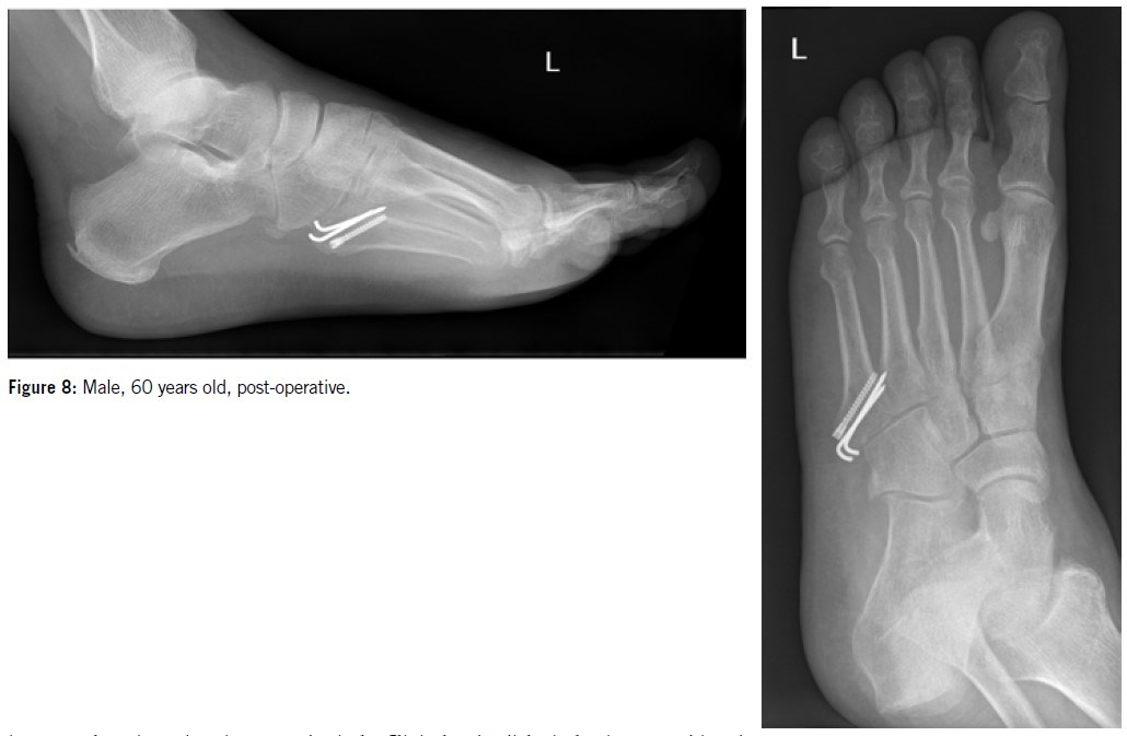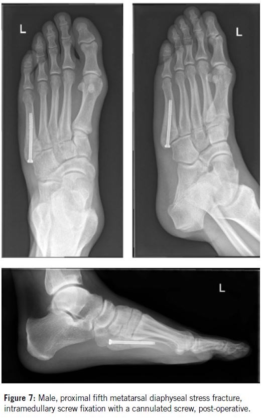 Due to the dorsal curvature of the proximal fifth metatarsal, proper care must be taken to ensure that the screw tip aligns as closely as possible with the bone’s axis. However, recent studies have reported several cases of failure following screw fixation in athletes9. The most frequently cited cause of delayed union and refracture is an early return to vigorous physical activity.