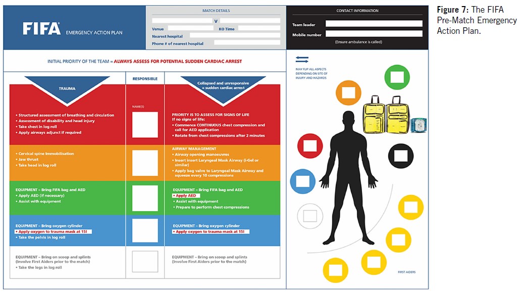 The Pre-Match Emergency Action Plan (PEAP) illustrates a process by which the FoP medical teams organise themselves at FIFA tournaments to deliver the best possible care in an emergency on the pitch. It is aimed at minimising the inherent risks when responding to a time-critical emergency in front of millions of spectators. The Pre-Match Emergency Action Plan links key clinical interventions with predetermined roles, thereby helping the FoP teams to manage the challenging human factors in this situation. The scripted and reproducible process replaces traditional reactive team dynamics with a proactive preparation model, based on the premise that the process for the emergency response remains the same regardless of the scenario. The PEAP necessitates team practice and scenario-based training by the field-of-play medical team to minimise stress and improve efficiency when called into action.