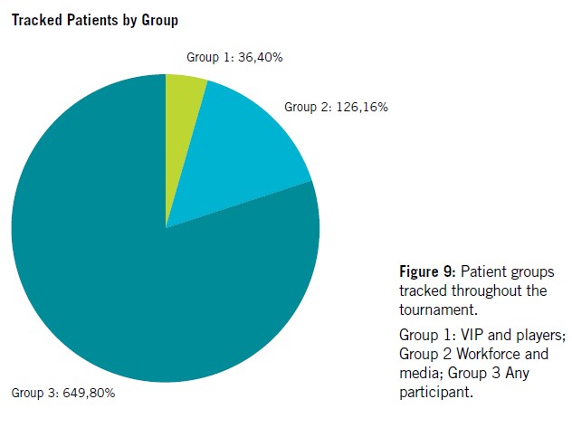 There was also real-time tracking of patients transferred from event sites to the hospital until their discharge, where identifying patient data was communicated separately from the clinical information through secure chat groups in real time. These patients were split into three groups: Group 1 was the Players and VIPs, Group 2 was FIFA Workforce and Media, and Group 3 was everyone else coming from an event site.