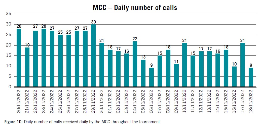 This setup enabled the development and installation of one Medical Command Centre (MCC) that would coordinate all medical matters concerning FWC2022 stakeholders throughout the entire tournament, resulting in substantial advantages from both the organiser and event owner perspective. The Medical Command Centre was considered the brain of the medical services provision and used a “hub and spoke” model. Critical incidents occurring within Qatar were fed to the MCC, allowing the MCC to strategise any medical event relating to the World Cup, using pre-determined emergency or clinical action plans. The MCC controlled all ambulance movements, organised transfers and admissions, family medicine and specialist appointments for all participants, notified FIFA Medical of all incidents in predefined groups of interest, created daily reports and was the gateway for team doctors in accessing any services, equipment or medication they needed outside of matches.