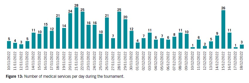 The polyclinic was fully operational as a 24h service 10 days before the tournament. Despite the fact that it could be assumed that all teams would arrive at the competition well prepared and without injuries, the polyclinic was in demand from the beginning. The number of medical services provided per day is illustrated in Figure 13.