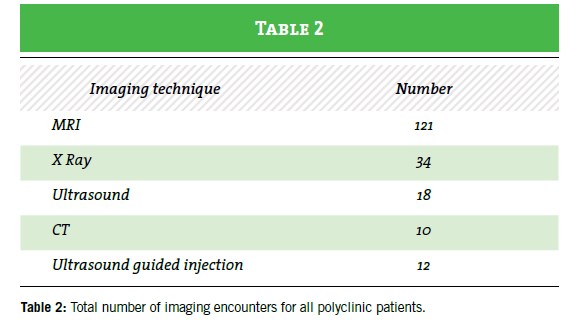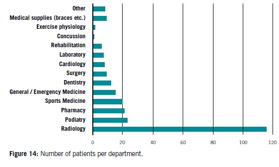 The busiest period was the second part of the group phase, which is in line with previous reports about the occurrence of injuries and illnesses during such tournaments. Another peak is visible towards the end of the tournament (15.–16. December). This because of a separate tournament involving former players and VIPs unrelated to the FWC2022 itself that generated a number of severe injuries. Overall, the department most in demand was radiology/medical imaging (Figure 12). The number of imaging requests per modality is shown in table 1. As can be expected from the typical injury profile in football, MRI was the modality most in demand (hamstring injuries are usually the most common injury in football). Interestingly, podiatry was the second most requested service. fig 12 TBL 2