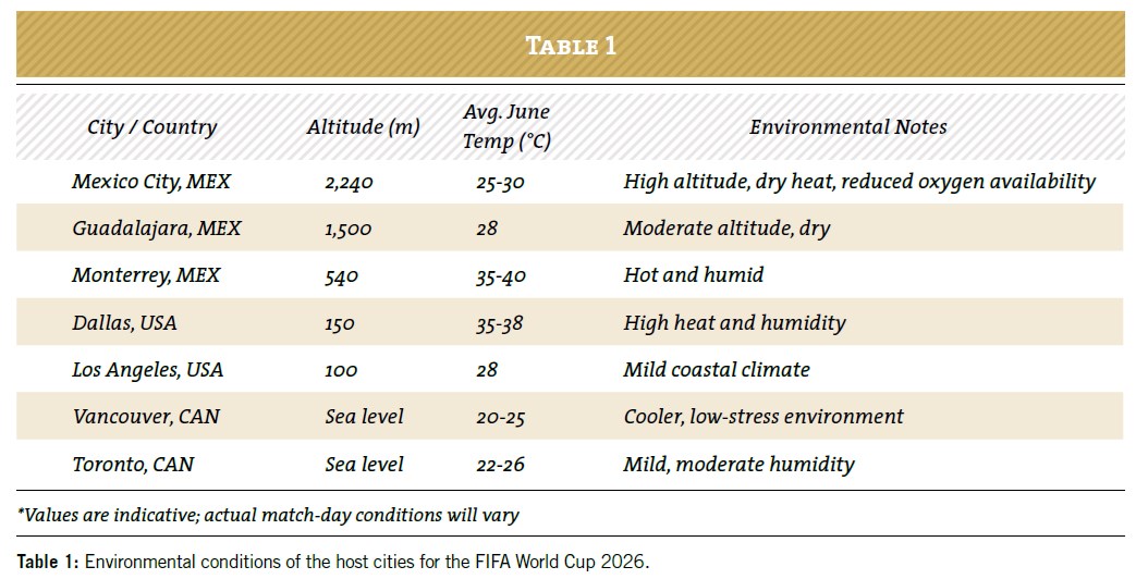 The environmental characteristics of host venues at the FIFA World Cup 2026 span a broad range of climatic and altitudinal conditions (Table 1). Teams may encounter sea-level environments, moderate altitude, dry heat and high humidity, sometimes within the same phase of the tournament and the likelihood of facing multiple environmental stressors across the competition is high.